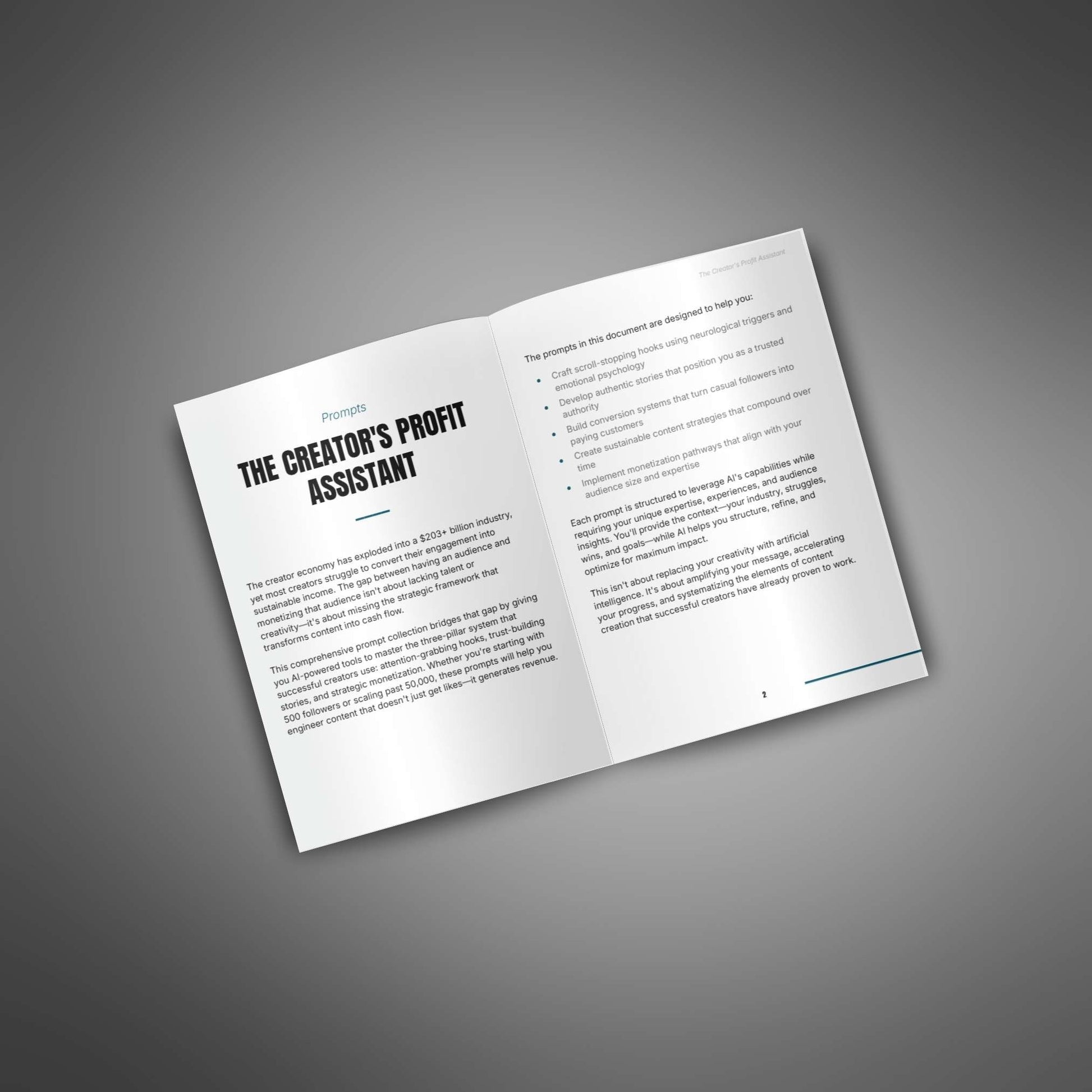 Offer your customers a powerful prompt pack that helps them stop guessing and start building a profitable creator business. Whether they are new creators or already growing an audience, this pack provides clear, actionable prompts to turn attention into income with structure and confidence.