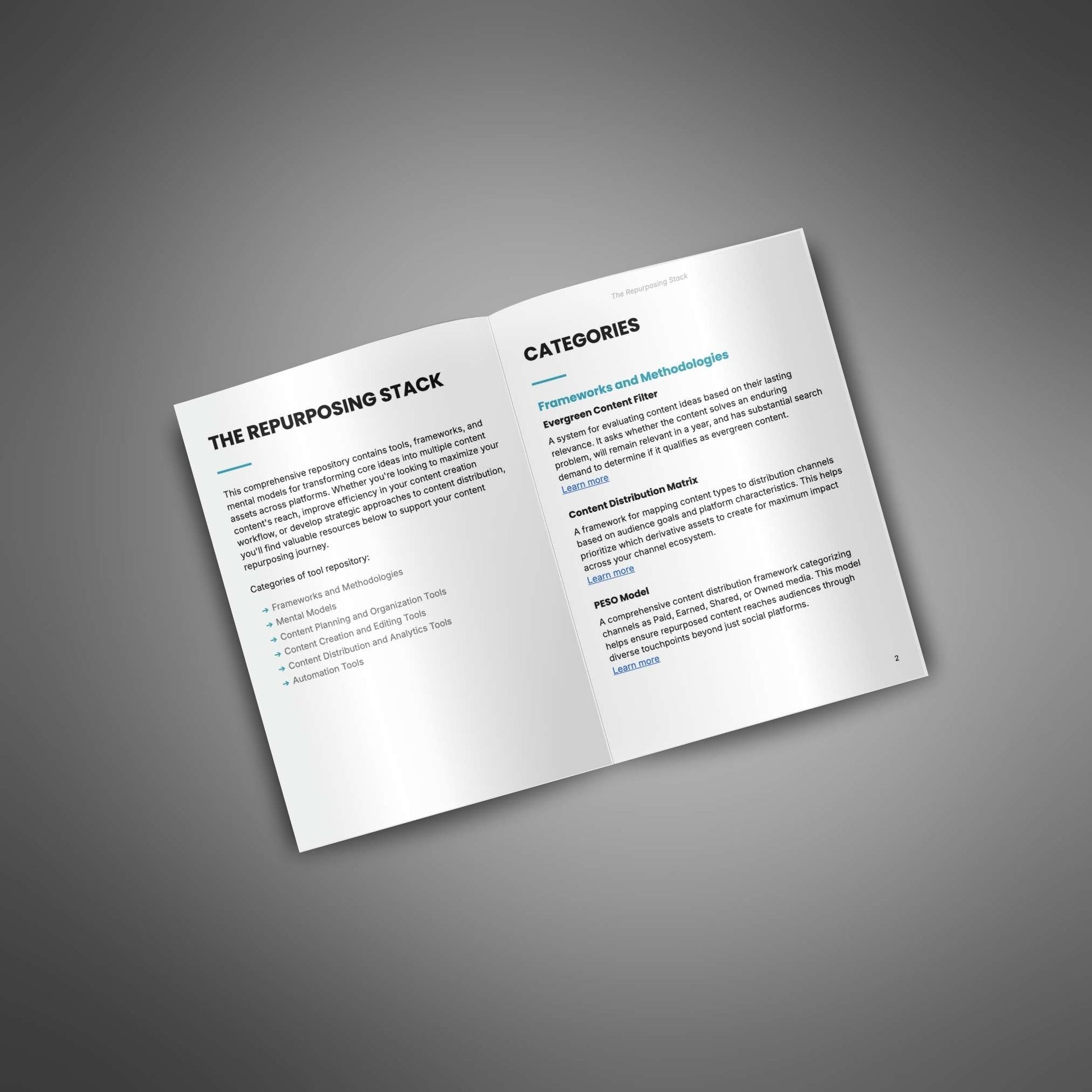 - Frameworks and Methodologies: Step-by-step systems that guide your customers through turning one content idea into many different formats for multiple platforms.